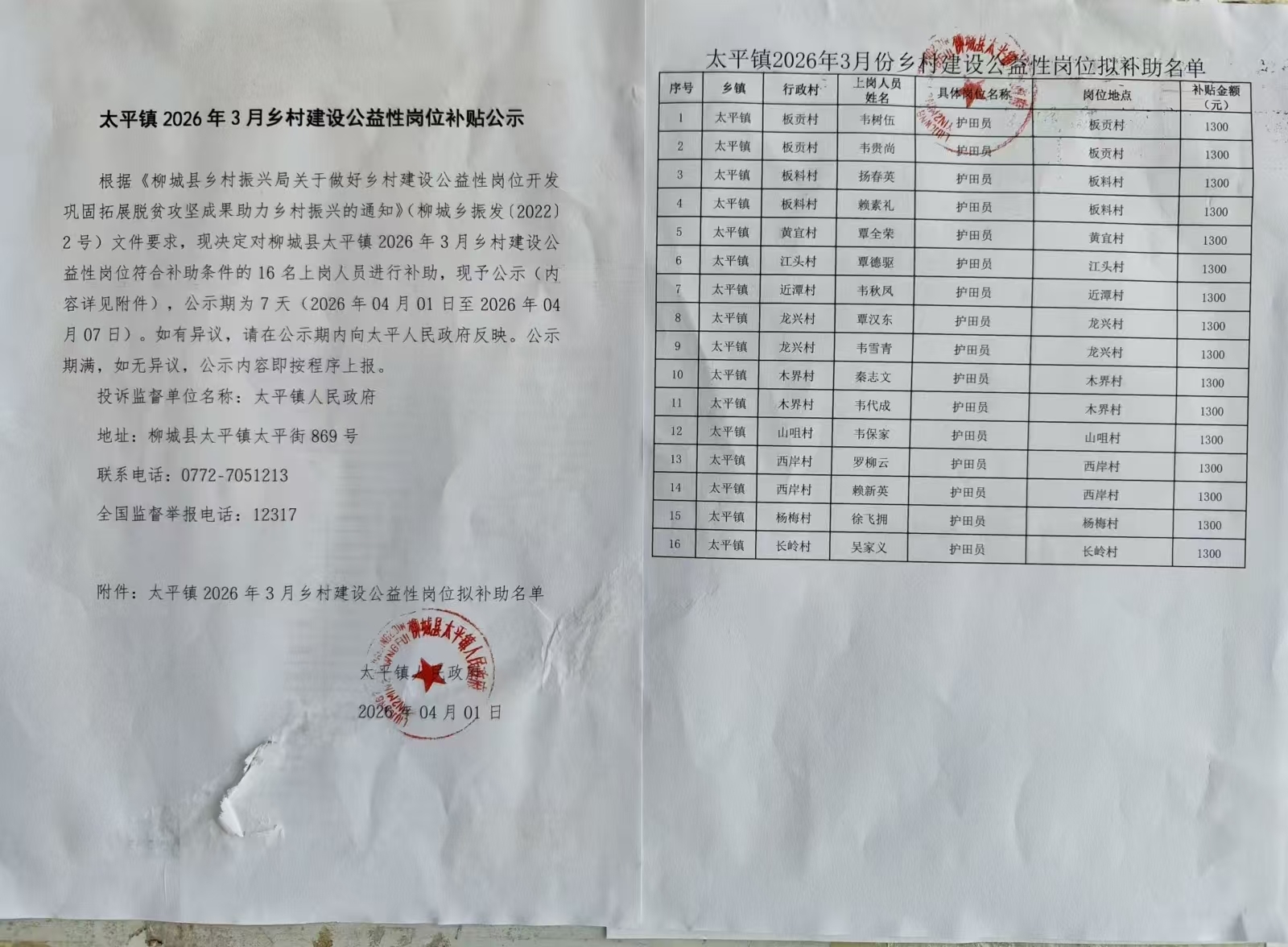 太平鎮(zhèn)2026年3月鄉(xiāng)村建設公益性崗位補貼公示
