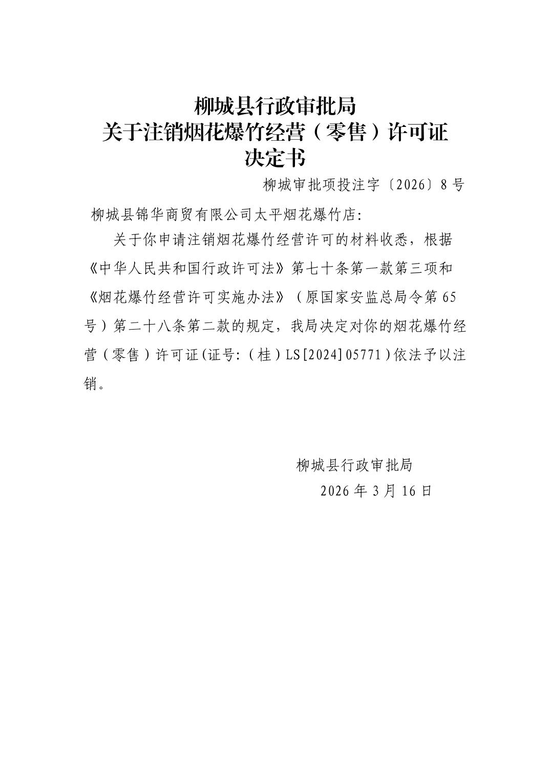柳城縣行政審批局關于注銷煙花爆竹經營(零售)許可證的決定書