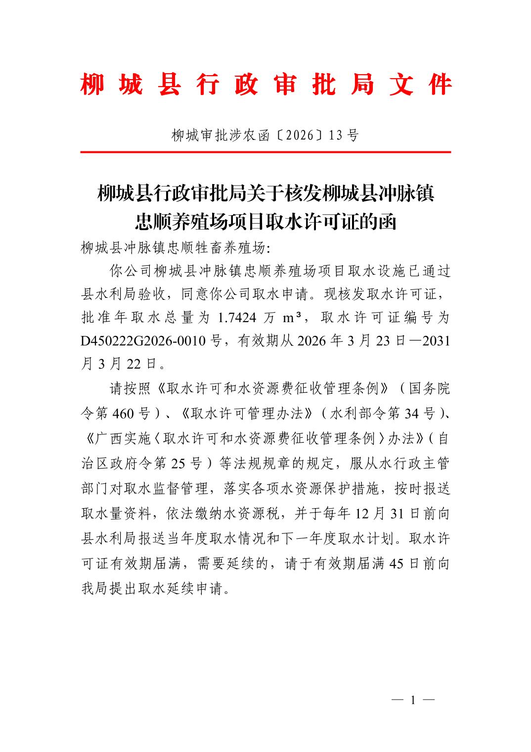 柳城縣行政審批局關(guān)于核發(fā)柳城縣沖脈鎮(zhèn)忠順牲畜養(yǎng)殖場取水許可證的函 -