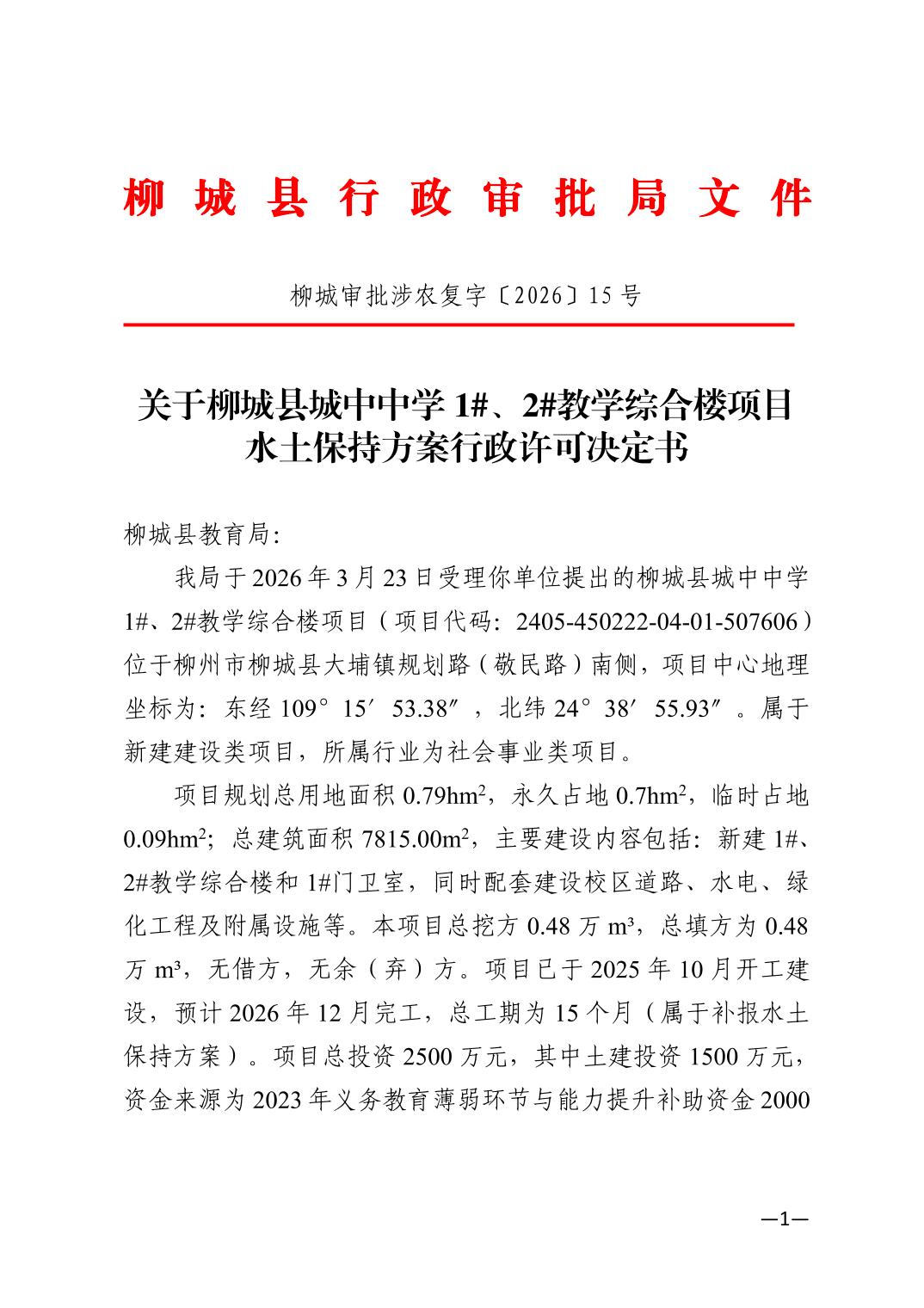 柳城縣城中中學(xué)1#、2#教學(xué)綜合樓項(xiàng)目水土保持方案行政許可決定書(shū)
