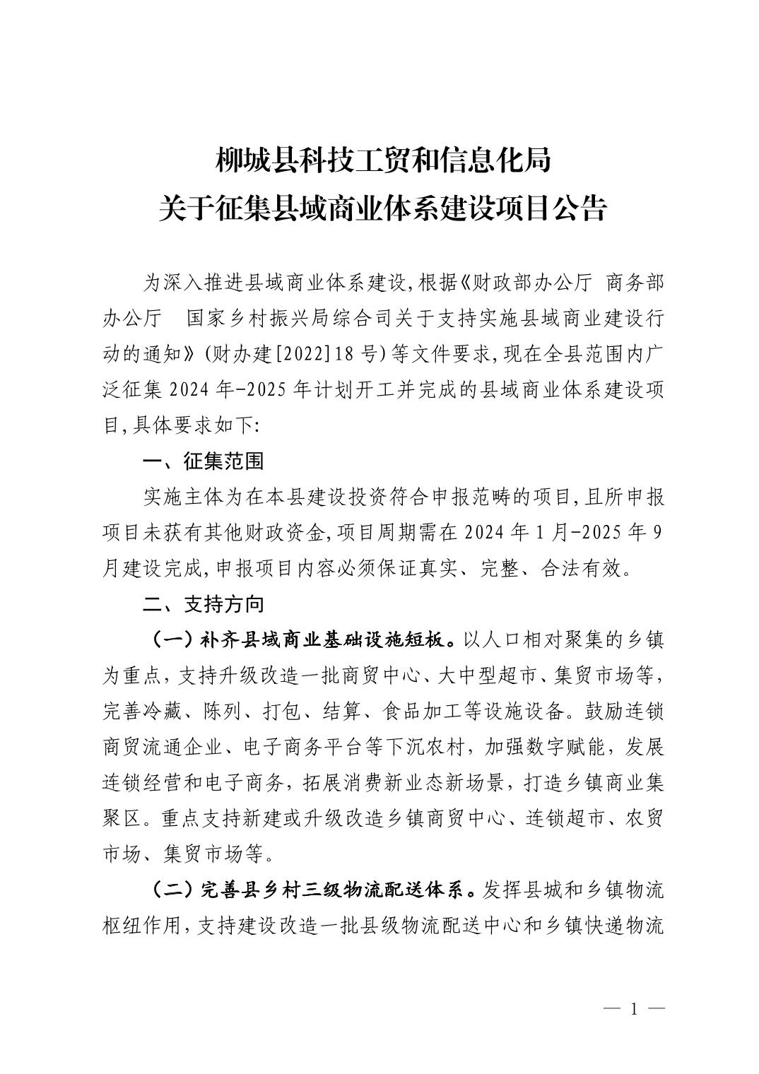 柳城縣科技工貿(mào)和信息化局 關(guān)于征集縣域商業(yè)體系建設(shè)項(xiàng)目公告