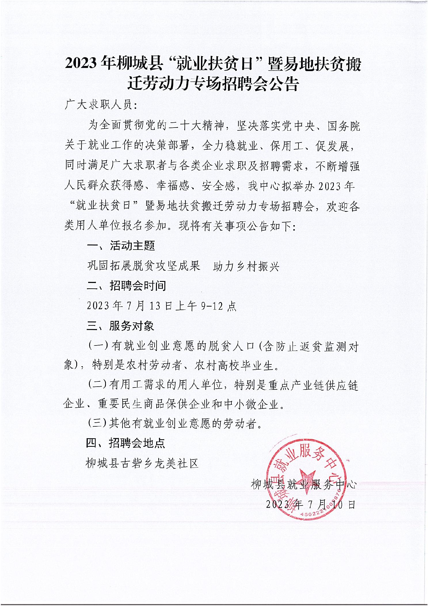 2023年柳城縣“就業(yè)扶貧日”暨易地扶貧搬遷勞動力專場招聘會公告