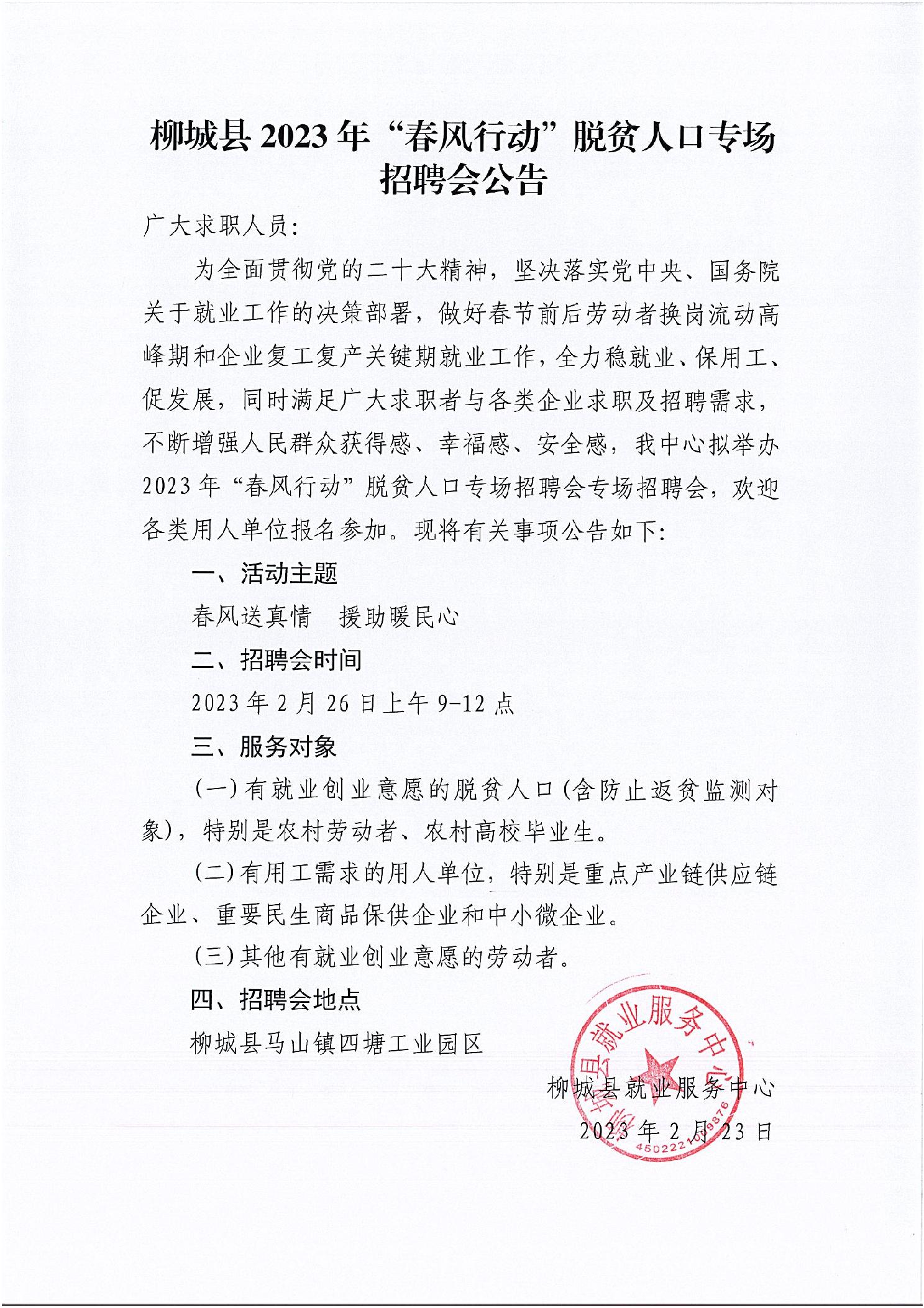 柳城縣2023年“春風(fēng)行動(dòng)”脫貧人口專場(chǎng)招聘會(huì)公告