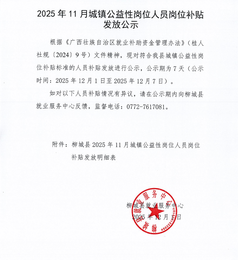 2025年11月城鎮(zhèn)公益性崗位人員崗位補貼發(fā)放公示