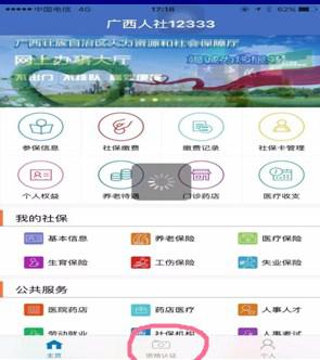 1.?進(jìn)入“廣西人社12333”app操作界面,點(diǎn)擊下端中間的“資格認(rèn)證”按鈕。如圖2:
