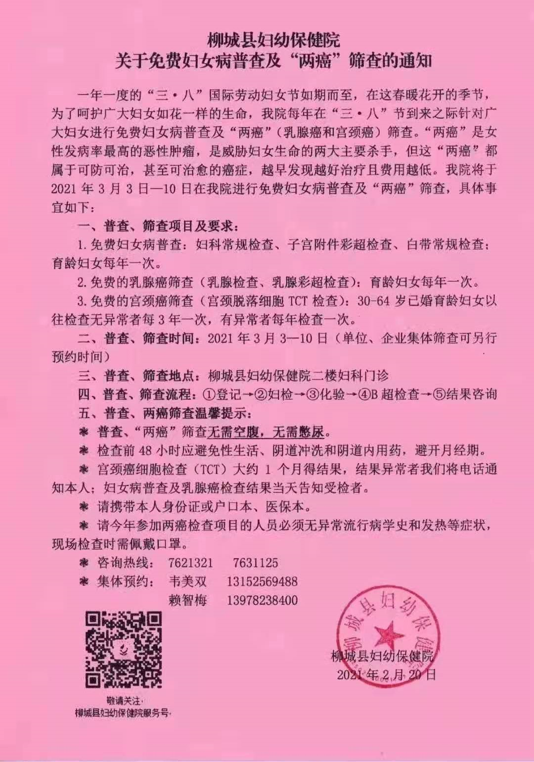 柳城縣婦幼保健院關(guān)于免費婦女病普查及“兩癌“篩查的通知