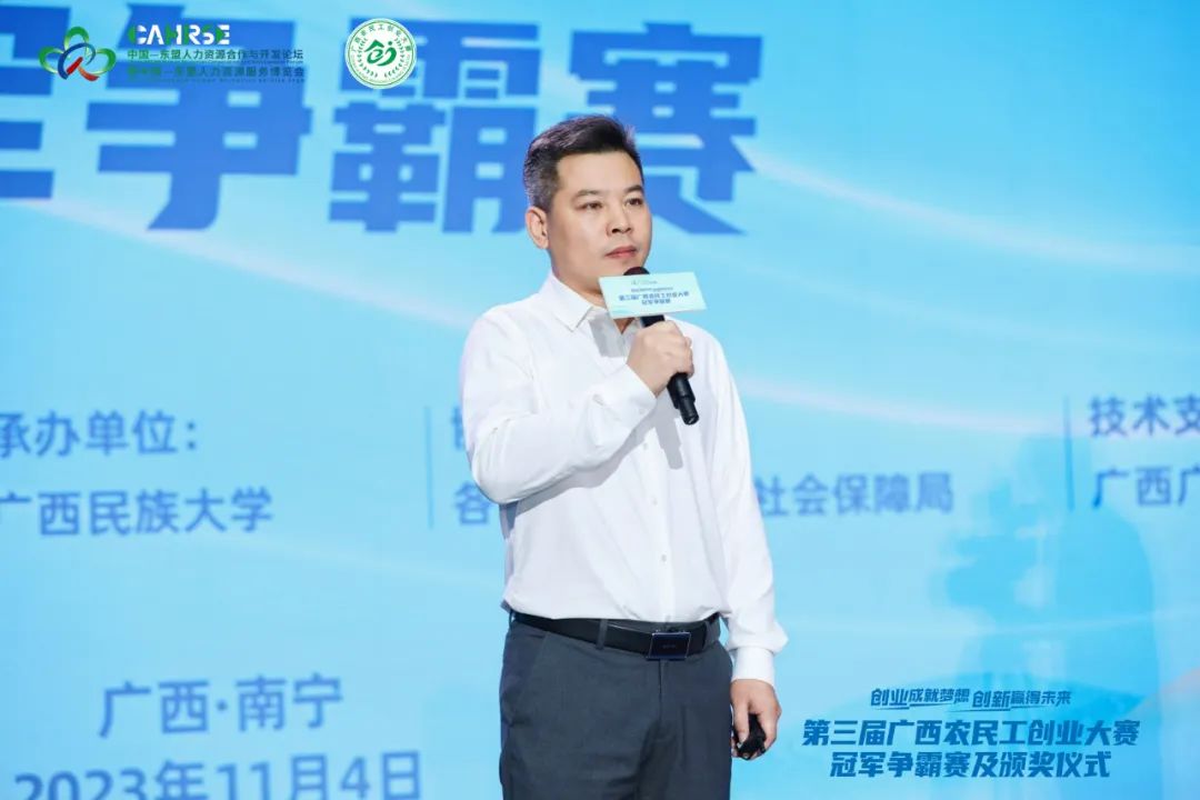 創(chuàng)業(yè)成就夢(mèng)想,創(chuàng)新贏得未來。11月4日,第三屆廣西農(nóng)民工創(chuàng)業(yè)大賽冠軍爭(zhēng)霸賽(以下簡(jiǎn)稱“爭(zhēng)霸賽”)在南寧舉辦,從第三屆廣西農(nóng)民工創(chuàng)業(yè)大賽脫穎而出的四個(gè)優(yōu)秀項(xiàng)目同臺(tái)比拼。和以往不同,本次爭(zhēng)霸賽納入中國—東盟人力資源合作與開發(fā)論壇暨中國—東盟人力資源服務(wù)博覽會(huì)的總體安排,在南寧國際會(huì)展中心現(xiàn)場(chǎng)進(jìn)行。