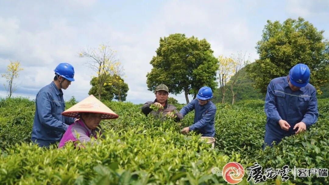柳城供電局工作人員與采茶工一同采茶。