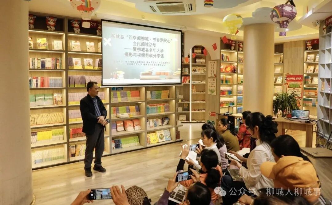揭牌當(dāng)天,新華書店內(nèi)還舉行了柳城縣“四季閱讀柳城·書香潤民心”全民閱讀活動——暨柳城縣老年大學(xué)攝影與視頻剪輯分享課。分享課緊扣群眾實(shí)際需求,將實(shí)用技能培訓(xùn)植入閱讀場景,既豐富了群眾精神文化生活,也讓“四季閱讀”基地的文化服務(wù)功能從“靜態(tài)閱覽”升級為“動態(tài)互動”,充分彰顯了其作為公共文化服務(wù)陣地的示范意義與實(shí)踐價值,為柳城全民閱讀深入開展注入新活力。