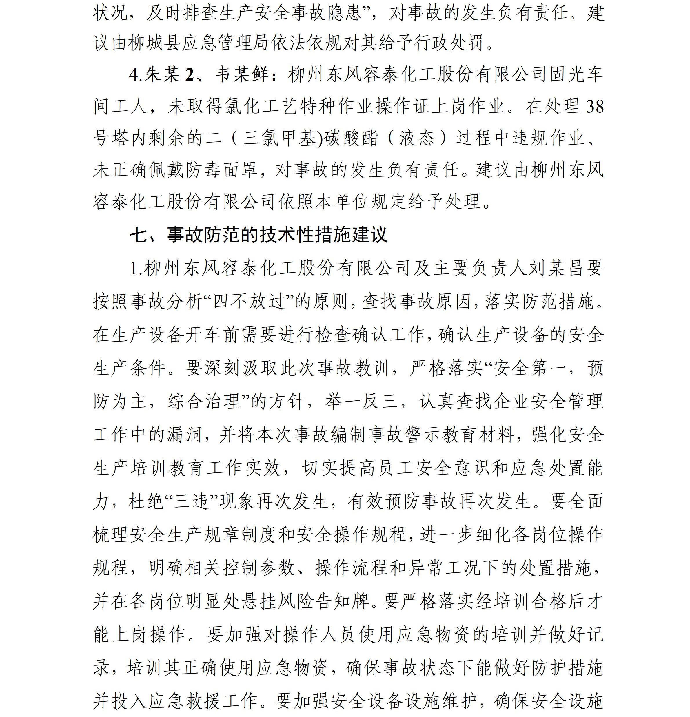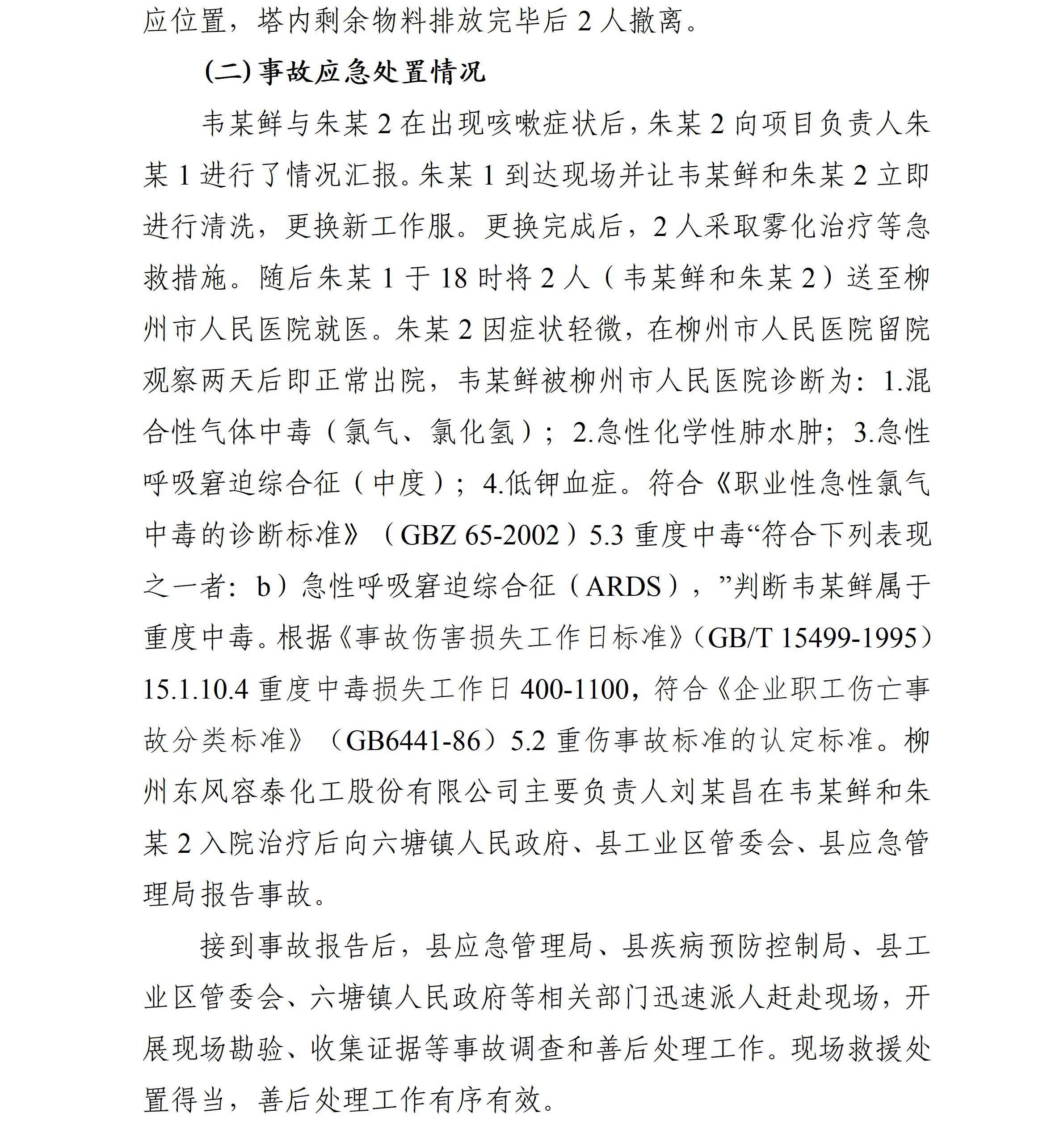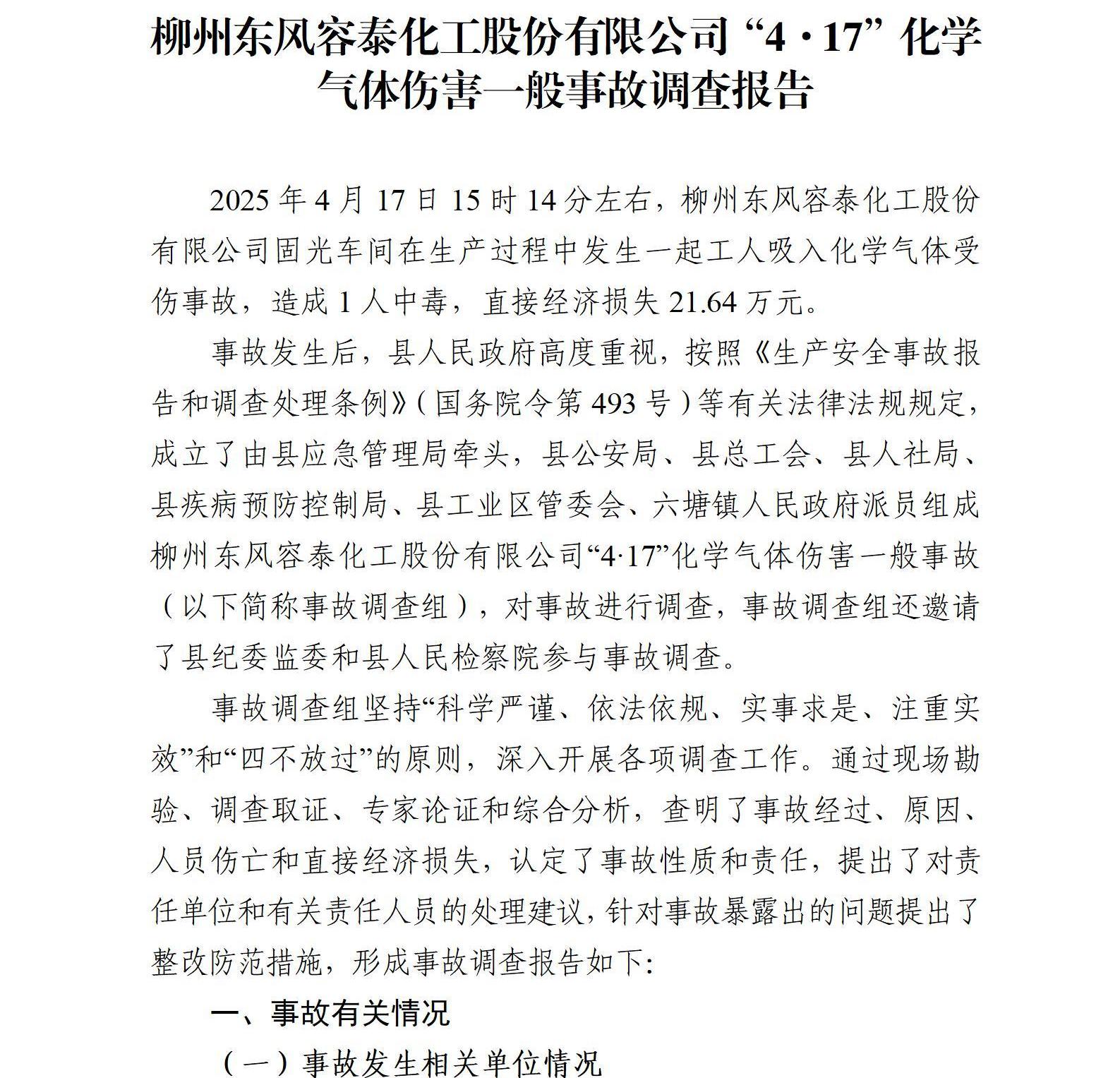 柳州東風(fēng)容泰化工股份有限公司“4·17”化學(xué)氣體傷害一般事故調(diào)查報告