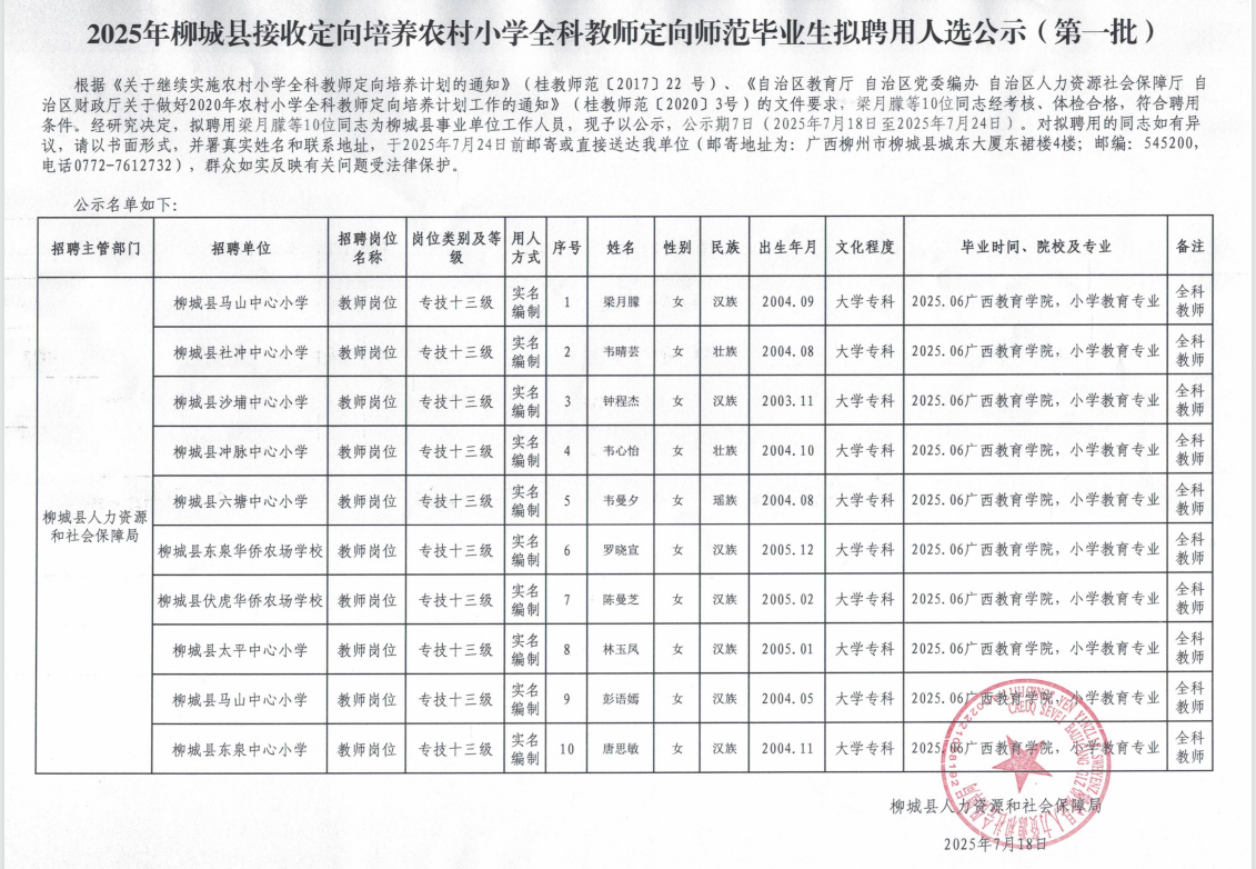 2025年柳城縣接收定向培養(yǎng)農(nóng)村小學(xué)全科教師定向師范畢業(yè)生擬聘用人選公示(第一批)