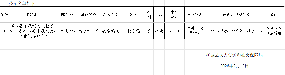根據(jù)《自治區(qū)黨委辦公廳自治區(qū)人民政府辦公廳 關(guān)于進一步引導(dǎo)和鼓勵高校畢業(yè)生到基層工作的通知》(廳發(fā)〔2018〕14號)文件精神,柳城縣服務(wù)期滿的三支一扶人員楊欣然同志經(jīng)考核、體檢合格,符合聘用條件。經(jīng)研究決定,擬聘用楊欣然同志為柳城縣事業(yè)單位工作人員,現(xiàn)予以公示,公示期7日(2026年2月12日至2月18日)。對擬聘用的同志如有異議,請以書面形式,并署真實姓名和聯(lián)系地址,于2026年2月18日前郵寄或直接送達我單位(郵寄地址為:廣西柳州市柳城縣城東大廈東裙樓4樓;郵編:545200,聯(lián)系電話:0772-7612732),群眾如實反映有關(guān)問題受法律保護。