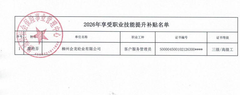 按照《廣西壯族自治區(qū)人力資源和社會保障廳財政廳關(guān)于印發(fā)失業(yè)保險支持參保職工提升職業(yè)技能補貼暫行辦法的通知》(桂人社發(fā)〔2017〕44號)文件精神,經(jīng)個人申報,我中心審核,以下人員符合失業(yè)保險支持參保職工提升職業(yè)技能補貼發(fā)放條件,現(xiàn)予公示,公示期為7天,即從2026年3月11日至2026年3月17日,公示期間,如有異議,請與柳城縣社會保險事業(yè)管理中心聯(lián)系,聯(lián)系電話:0772-7614291。