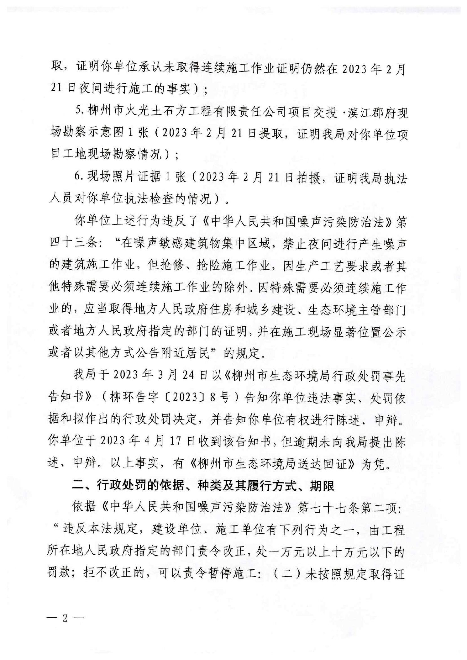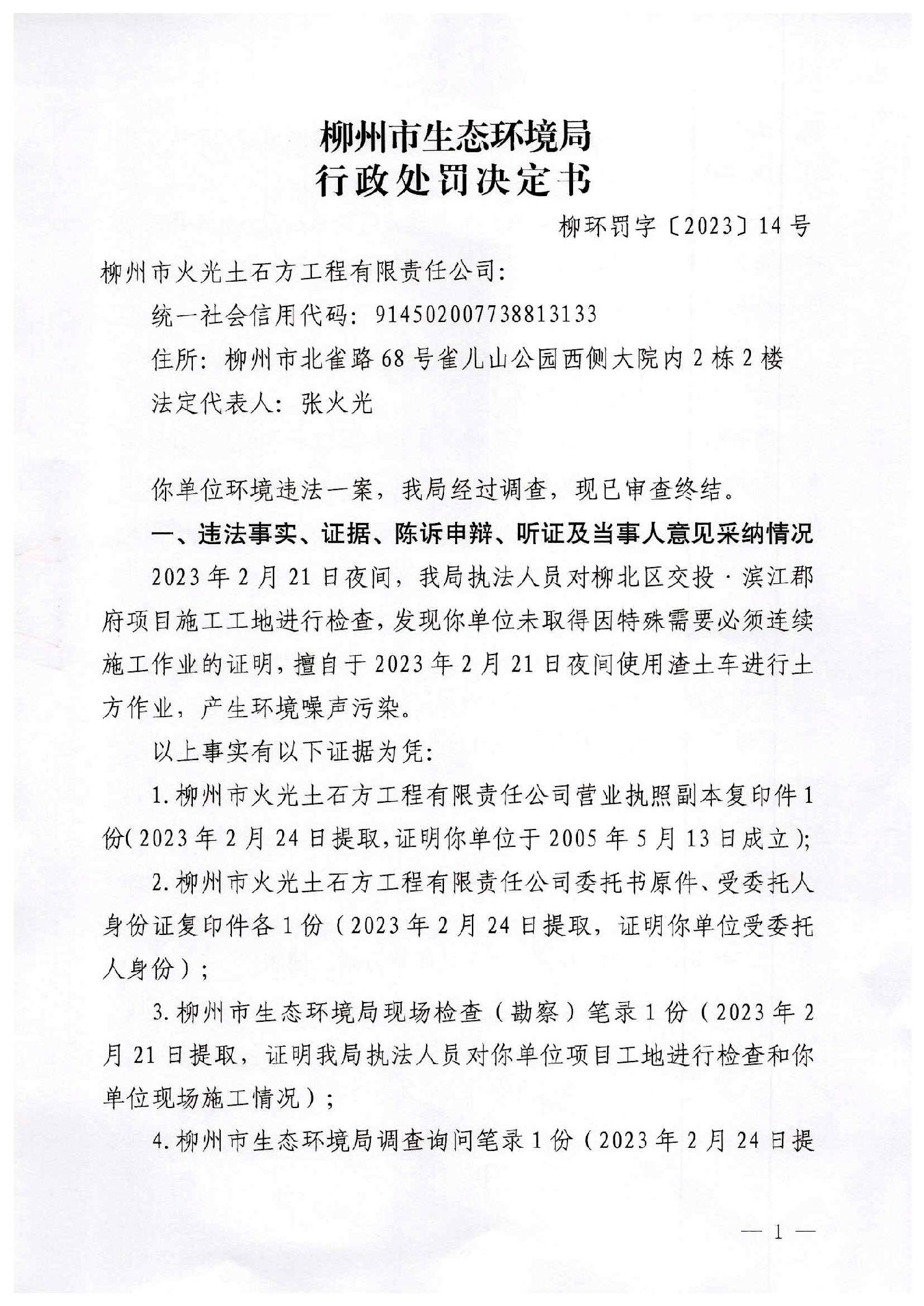 柳州市生態(tài)環(huán)境局行政處罰決定書 柳環(huán)罰字〔2023〕14號--柳州市火光土石方工程有限責(zé)任公司