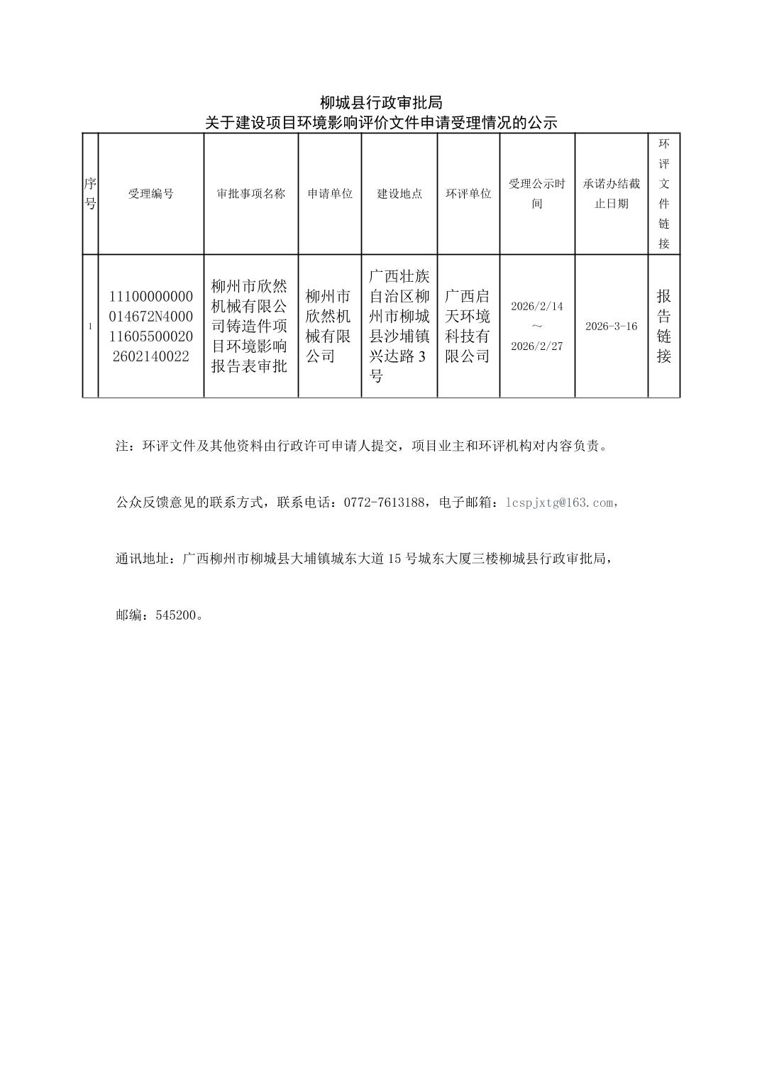 柳城縣行政審批局關(guān)于建設(shè)項目環(huán)境影響評價文件申請受理情況的公示