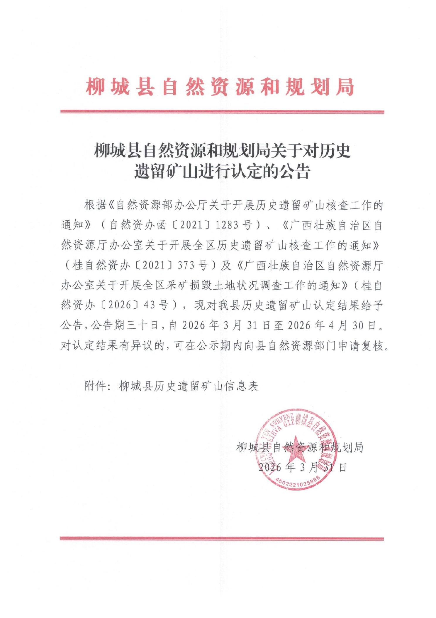 柳州市柳城縣自然資源和規(guī)劃局關(guān)于對歷史遺留礦山進(jìn)行認(rèn)定的公告