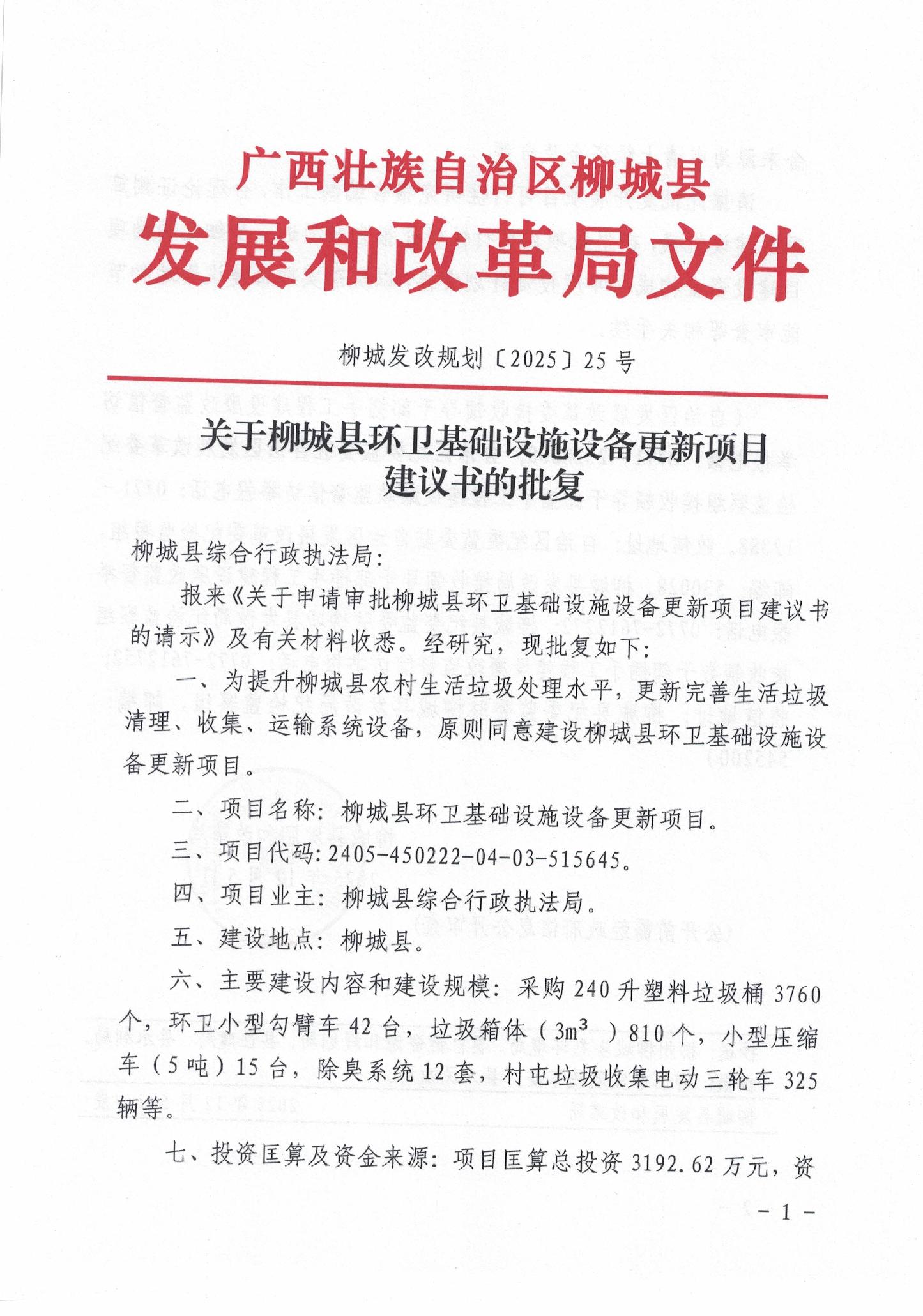 關(guān)于柳城縣環(huán)衛(wèi)基礎(chǔ)設(shè)施設(shè)備更新項(xiàng)目建議書的批復(fù)
