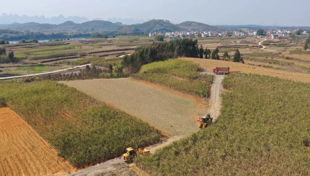 近日,在柳城縣龍頭鎮(zhèn)碼頭村,2臺甘蔗收割機(jī)和收料斗車開足馬力在蔗地里來回穿梭,從砍收、剝?nèi)~、切段、輸出到收集進(jìn)斗,所有步驟一氣呵成,原本需要多名工人完成的工作,現(xiàn)在只需要操作機(jī)器就可以完成。