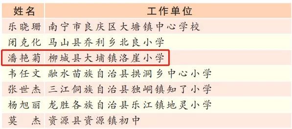 由于潘艷菊政治素養(yǎng)好,業(yè)務(wù)精湛,工作成績突出,2016年她被評為“柳州市師德模范”;2011年被評為“柳州市優(yōu)秀教師”;2006、2008、2010年三次被評為“柳城縣優(yōu)秀教師”;六次年度考核被評為優(yōu)秀等級;2019年9月,通過層層考核,她入選了“全國鄉(xiāng)村優(yōu)秀青年教師培養(yǎng)獎勵計劃”;2022年9月被評為柳城縣“最美教育人”。