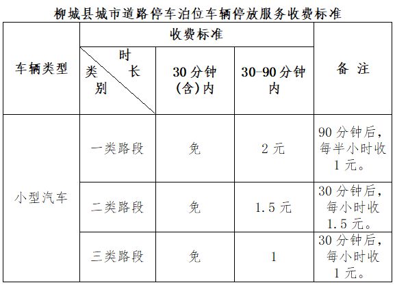 所有車輛停車30分鐘內(nèi)免費(fèi)。停車30分鐘后,小型汽車按每小時(shí)2元收取,不足1小時(shí)按1小時(shí)計(jì)。24小時(shí)內(nèi)小型汽車最高限價(jià)15元,中、大型汽車最高限價(jià)30元。摩托車、電動(dòng)自行車按1元/輛.次收取。