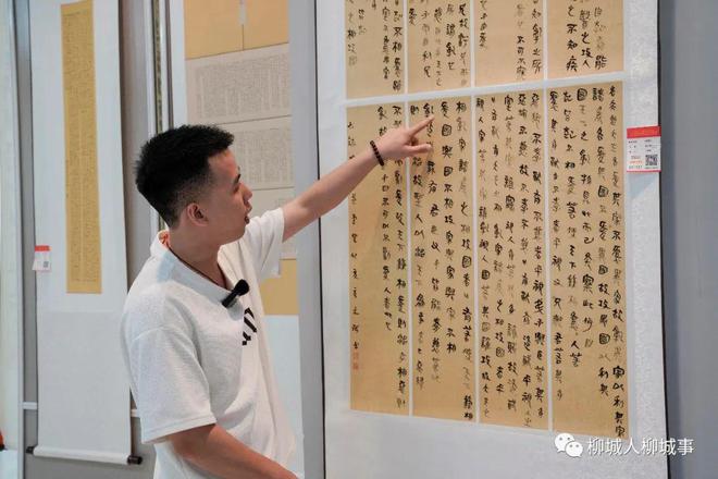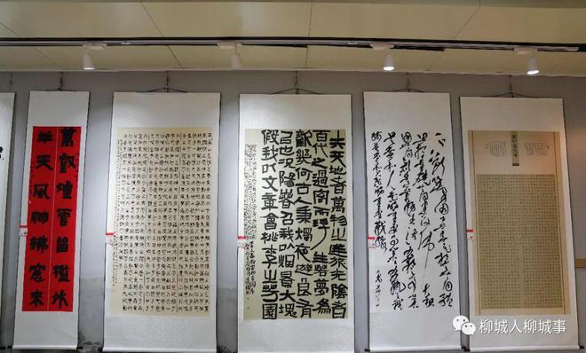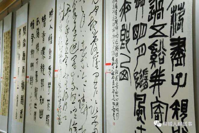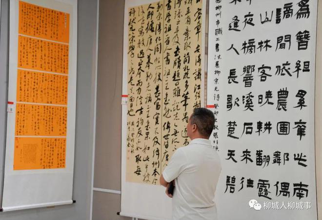 在柳城縣總工會一樓展廳,來自柳州市各縣區(qū)參賽者的100幅作品一一懸掛在展示墻或展示架上,行書、草書、隸書等各類型字體書法作品各展風(fēng)采,吸引眾多書法愛好者們紛紛駐足欣賞。