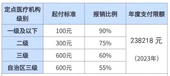 參保年度內(nèi),參保人員因病在定點(diǎn)醫(yī)療機(jī)構(gòu)住院,扣除起付標(biāo)準(zhǔn)后,發(fā)生符合基本醫(yī)療保險(xiǎn)支付范圍的醫(yī)療費(fèi)用,由統(tǒng)籌基金和個(gè)人按比例進(jìn)行支付。年度基金最高支付限額為每年1月1日前統(tǒng)計(jì)部門最新公布的上年度廣西城鎮(zhèn)居民人均可支配收入的6倍。(例如2023年城鄉(xiāng)居民基本醫(yī)療保險(xiǎn)基金年度最高支付限額為238218元)