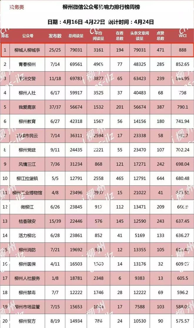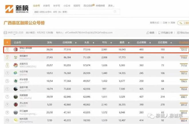 今年以來,“柳城人柳城事”公眾號發(fā)布新聞324期1257條,其中1萬以上閱讀量的新聞13條。微信公眾號“柳城人柳城事”基本保持在“柳州微信公眾號影響力排行榜”政務(wù)類榜單縣區(qū)前三,其中,在今年4月,微信公眾號“柳城人柳城事”,在廣西縣區(qū)融媒公眾號榜周榜和柳州微信公眾號影響力排行榜周榜上,排名雙第一。