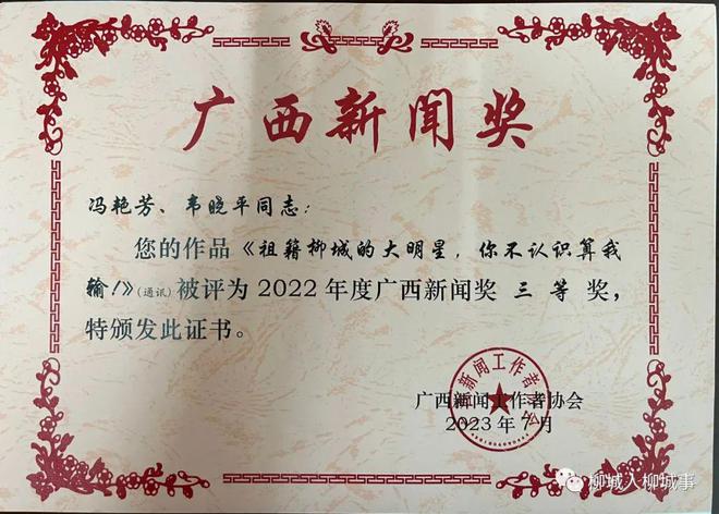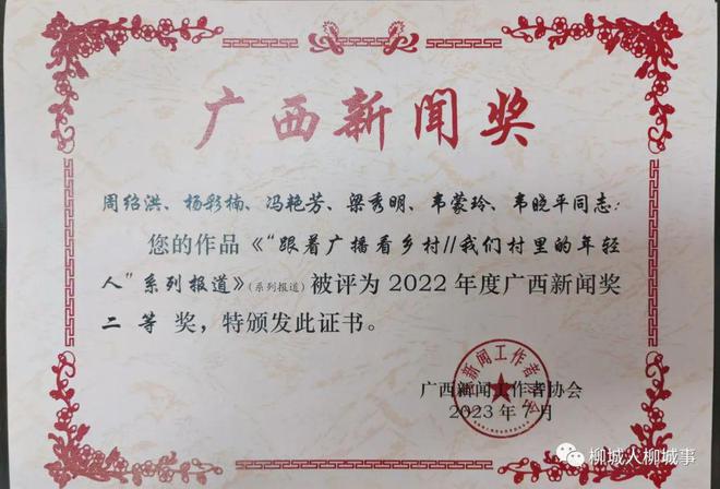 付出終有回報!今年7月,自治區(qū)公布2022年度廣西新聞獎評選結(jié)果,其中,柳城縣融媒體中心在柳城人柳城事微信公眾號發(fā)布的《祖籍柳城的大明星,你不認(rèn)識算我輸!》喜獲2022年度廣西新聞獎新聞通訊類三等獎。另外,柳城縣融媒體中心與柳州市廣播電視臺合作推出的《“跟著廣播看鄉(xiāng)村//我們村里的年輕人”系列報道》喜獲2022年度廣西新聞獎新聞系列報道類二等獎。這也是柳城縣融媒體中心成立以來,首次入選廣西新聞獎。