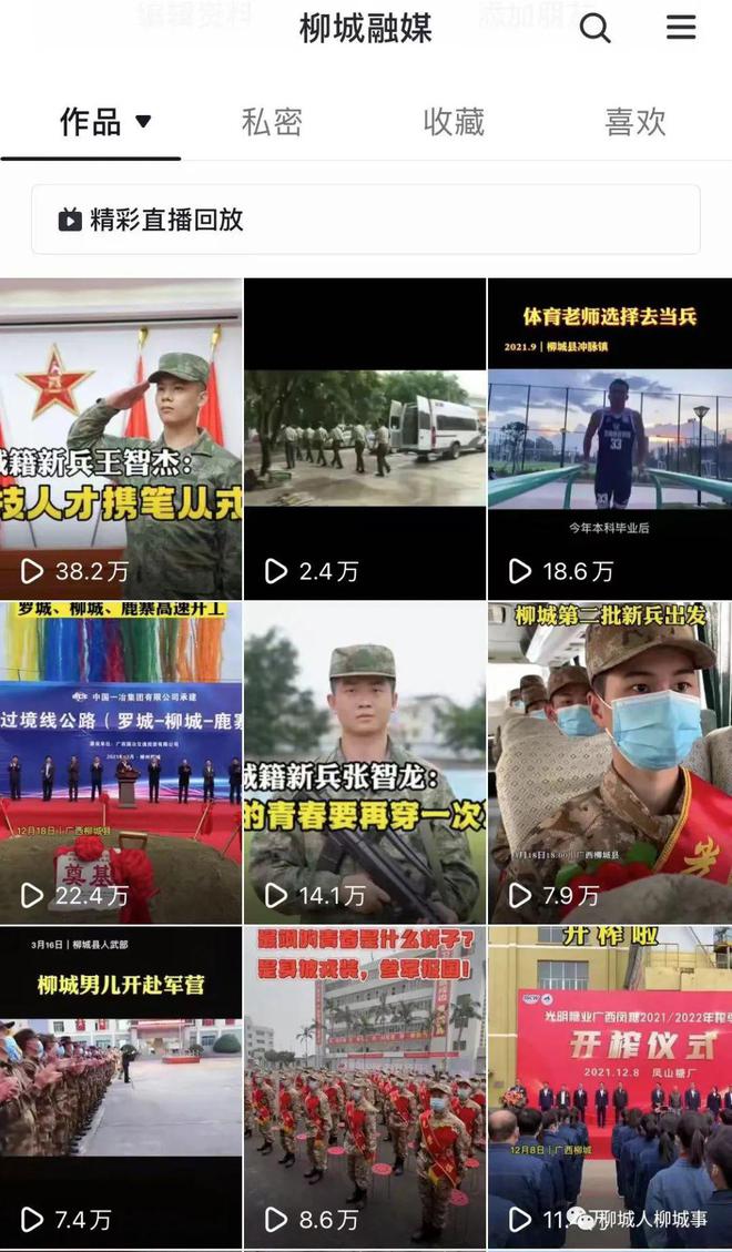 柳城縣融媒體中心制作了“柳城·歷史回音”、“柳城籍新兵系列報道”等一大批優(yōu)秀中短視頻,在視頻號、抖音等平臺播出,取得了良好的傳播效果。目前,“柳城融媒”視頻號、抖音號平臺發(fā)布420多條短視頻,前三季度累計播放量達(dá)1150萬。其中,“柳城融媒”視頻號10萬+短視頻有14個,1萬+短視頻有146個,播放量最高的達(dá)38萬+?!傲侨诿健倍兑籼?0萬+短視頻8個,1萬+短視頻147個,播放量最高的達(dá)38萬+。