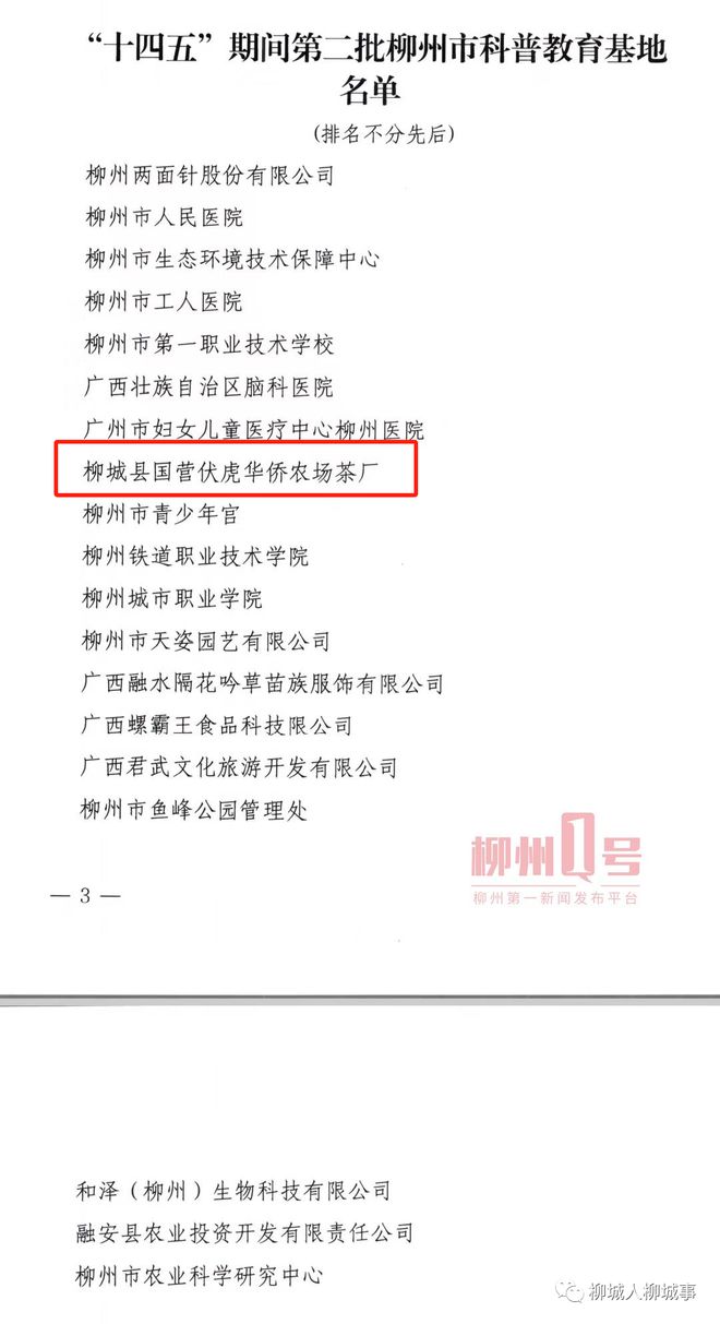 近日,柳州市科協(xié)公布了“十四五”期間第二批柳州市科普教育基地的認定名單,共有 19家單位在內(nèi),基地有效期為五年,市民可免費參觀打卡。其中,柳城縣國營伏虎華僑農(nóng)場茶廠入選。