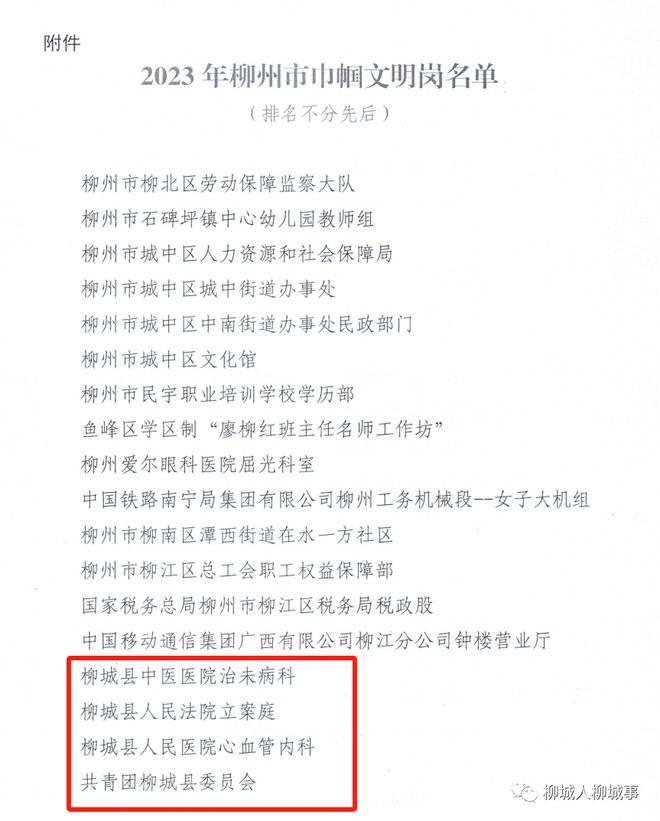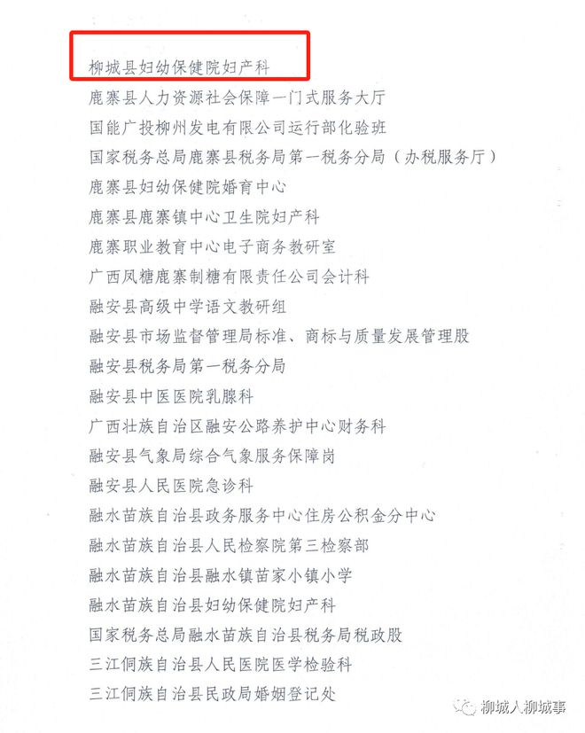 其中,柳城縣中醫(yī)醫(yī)院治未病科、柳城縣人民法院立案庭、柳城縣人民醫(yī)院心血管內(nèi)科、共青團(tuán)柳城縣委員會(huì)、柳城縣婦幼保健院婦產(chǎn)科共5個(gè)崗組(集體)獲評(píng)柳州市巾幗文明崗。