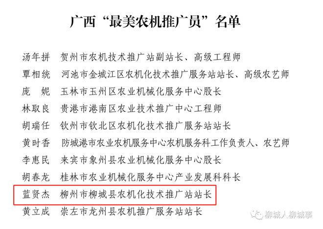 近日,廣西壯族自治區(qū)農(nóng)業(yè)機械化服務(wù)中心公布廣西“最美農(nóng)機推廣員”、優(yōu)秀農(nóng)機化示范項目、十佳農(nóng)機應(yīng)急救災(zāi)保障服務(wù)組織名單。其中,柳城縣農(nóng)機化技術(shù)推廣站站長藍賢杰榮獲廣西“最美農(nóng)機推廣員”稱號。