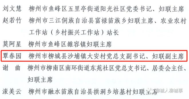 近日,自治區(qū)婦聯通報表揚100名廣西“最美基層婦聯干部”。其中,柳城縣沙埔鎮(zhèn)大安村黨總支副書記、婦聯副主席覃春園上榜。