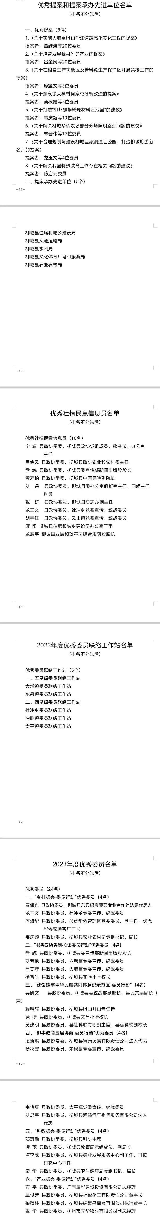 會(huì)議對(duì)政協(xié)十屆委員會(huì)以來提出的8件優(yōu)秀提案,5個(gè)提案承辦先進(jìn)單位,10名優(yōu)秀社情民意信息員和5個(gè)優(yōu)秀委員聯(lián)絡(luò)站進(jìn)行了表揚(yáng),對(duì)參加“鄉(xiāng)村振興·委員行動(dòng)”“書香政協(xié)香飄柳城·委員行動(dòng)”“建設(shè)鑄牢中華民族共同體意識(shí)示范區(qū)·委員行動(dòng)”等活動(dòng)中的24名優(yōu)秀委員進(jìn)行表揚(yáng)并頒發(fā)榮譽(yù)證書。