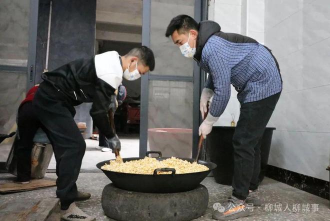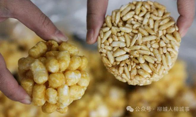 米花糖在柳城也算是一種比較常見的小吃,用大米和玉米兩種食材來做爆米花,再把爆好的米花和糖漿混合,得到一個圓形的米花球,不同食材,不同口感,但都酥脆香甜,是不少家庭都喜歡備的年貨。