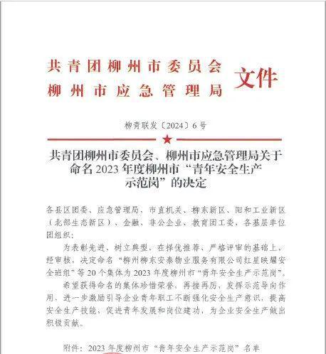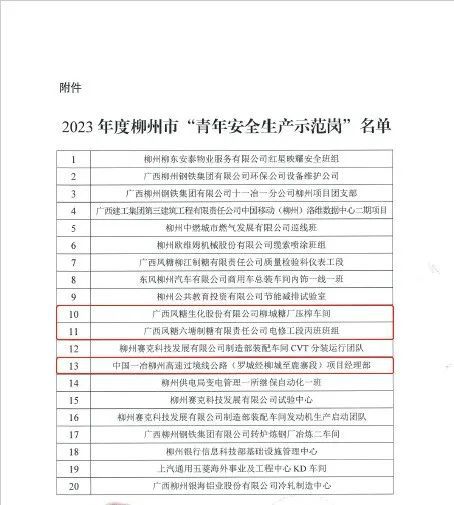 近日,共青團(tuán)柳州市委員會、柳州市應(yīng)急管理局聯(lián)合公布了 “2023年度柳州市青年安全生產(chǎn)示范崗”名單,其中,柳城縣推薦的廣西鳳糖生化股份有限公司柳城糖廠壓榨車間、廣西鳳糖六塘制糖有限責(zé)任公司電修工段丙班班組、中國一冶柳州高速過境線公路(羅城經(jīng)柳城至鹿寨段)項(xiàng)目經(jīng)理部3個(gè)集體獲評2023年度“柳州市青年安全生產(chǎn)示范崗”。