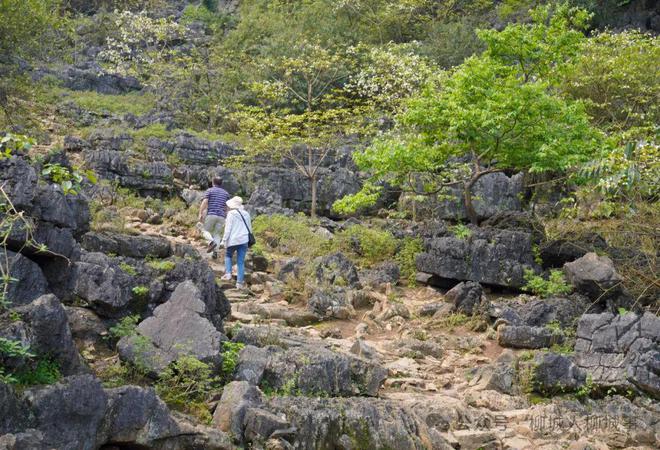 從拉建屯徒步進(jìn)入山谷要走1公里多的路程,用時大概1小時。一路上走的都是石板鋪成的路面,沿途有大片的竹林、楓樹林,還能看到上百歲的老樟樹,翻越兩座山坳后就能看到綠如大草原了。