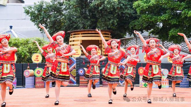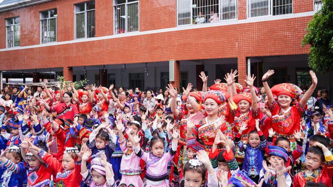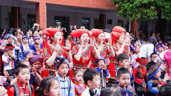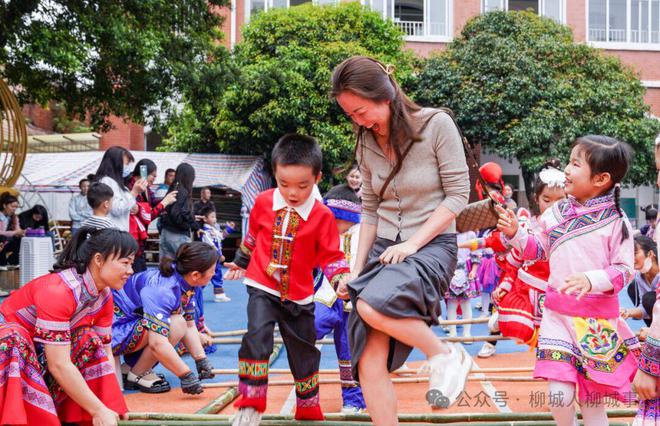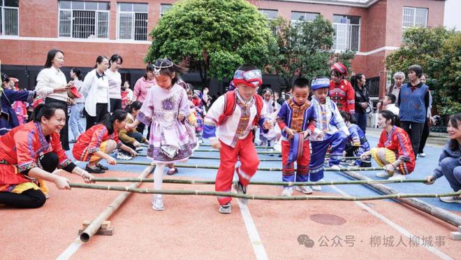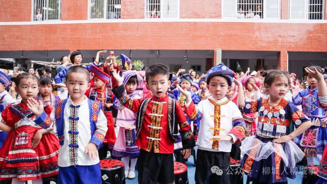 活動現(xiàn)場,各位小萌娃穿著苗族、壯族、仫佬族等風(fēng)格各異的少數(shù)民族服飾,齊聚操場上,觀看《 彌渡山歌 》《師公舞》《小金鳳》等精彩的舞蹈節(jié)目。全體師生齊對山歌《什么水面打跟斗》、跳起《大地飛歌》集體舞蹈?;顒舆€設(shè)置了跳竹竿舞環(huán)節(jié),萌娃們跟著音樂,有地拉著同學(xué),有地跟著老師跳起了歡快的竹竿舞,校園內(nèi)歡聲笑語不斷。