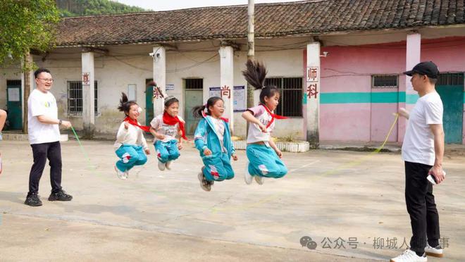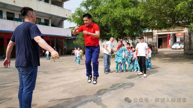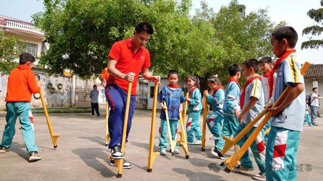 隨后,學(xué)生們興致勃勃地邀請何沖一起玩高蹺和跳繩,現(xiàn)場一片歡聲笑語。