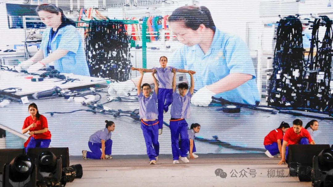 在柳州市雙飛汽車電器配件制造有限公司工會委員會代表隊(duì)的節(jié)目《制造魂》中,職工們身著工裝,在激昂動(dòng)感的音樂聲中忙碌工作,爭分奪秒完成訂單任務(wù),亦歌亦舞間將觀眾帶至火熱的生產(chǎn)車間。