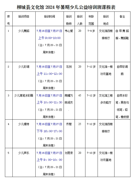 上課時間詳見《柳城縣文化館2024年暑期少兒公益培訓班課程表》