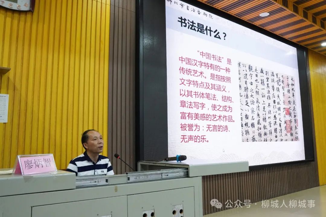 本次開班儀式邀請(qǐng)了廣西書法家協(xié)會(huì)副主席、中國(guó)書法家協(xié)會(huì)會(huì)員、柳州市書法藝術(shù)院院長(zhǎng)廖炳智作開班培訓(xùn)。課上,廖炳智院長(zhǎng)結(jié)合自身學(xué)習(xí)書法的經(jīng)歷和感受,以幽默風(fēng)趣、通俗易懂的語(yǔ)言,從練習(xí)書法的意義、畫風(fēng)理解、書法作品的章法和創(chuàng)作等方面進(jìn)行了詳細(xì)的講解,帶大家領(lǐng)略了書法藝術(shù)的獨(dú)特魅力,調(diào)動(dòng)大家的學(xué)習(xí)興趣。這也是廖炳智連續(xù)受邀到柳城授課的第9個(gè)年頭。