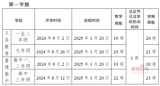 (一)義務教育學校按《廣西壯族自治區(qū)義務教育課程實施辦法(2023年版)》執(zhí)行。一至九年級全學年周數(shù)共39周,其中教學時間37周,學校機動時間2周。