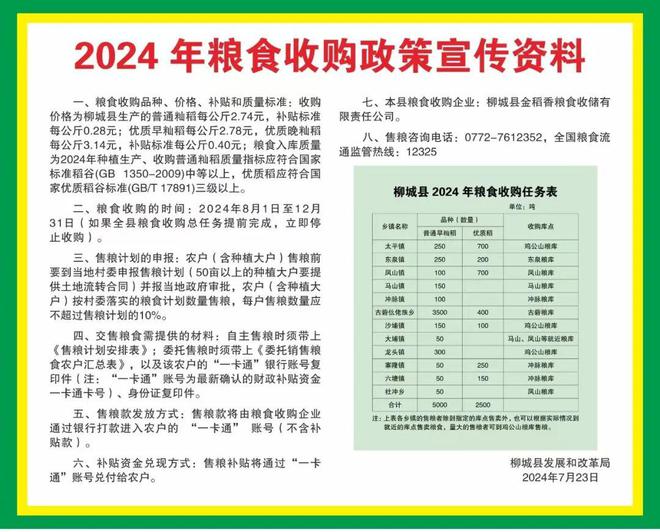 根據(jù)《《自治區(qū)農(nóng)業(yè)農(nóng)村廳、自治區(qū)發(fā)展改革委、自治區(qū)財(cái)政廳、自治區(qū)糧食和儲備局、農(nóng)發(fā)行廣西分行關(guān)于印發(fā)2024年稻谷補(bǔ)貼實(shí)施方案的通知》(桂農(nóng)廳發(fā)〔2024〕37號)文件精神,現(xiàn)將柳城縣2024年糧食收購政策通告如下: