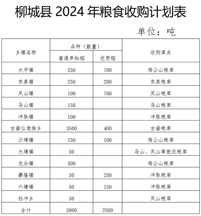 2024年自治區(qū)下達(dá)給柳城縣的糧食收購任務(wù)是7500噸,其中普通秈稻5000噸、優(yōu)質(zhì)稻(含專用稻)2500噸。根據(jù)柳城縣糧食種植情況,糧食收購計(jì)劃安排如下: