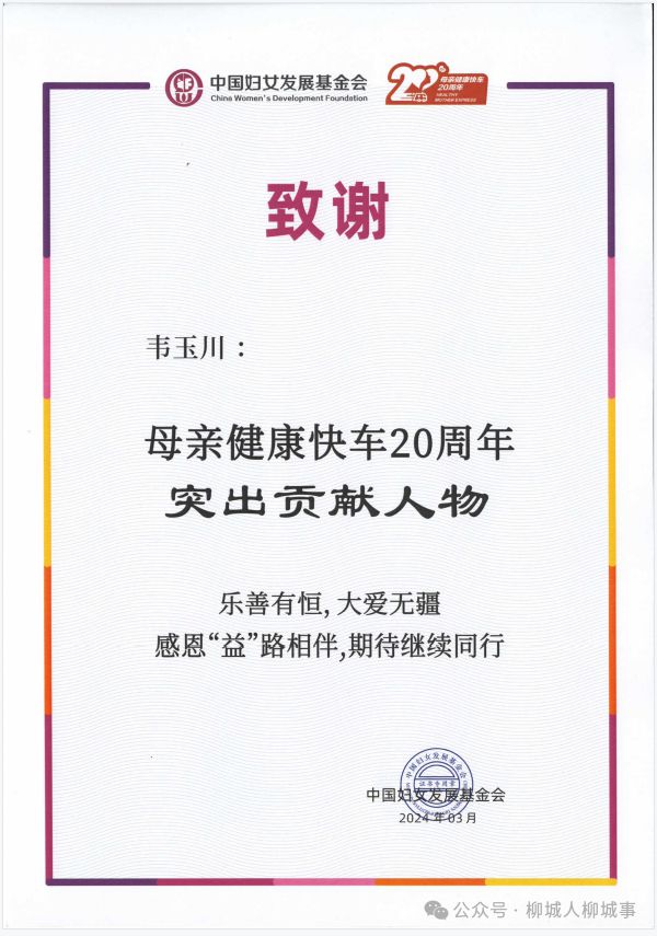 韋玉川始終保持著一顆醫(yī)者仁心在崗位上默默奉獻(xiàn)著。她的努力也得到了認(rèn)可,多次榮獲“優(yōu)秀醫(yī)生”和“優(yōu)秀共產(chǎn)黨員”等榮譽(yù)稱號。今年3月,韋玉川被中國婦女發(fā)展基金會評選為“母親健康快車20周年突出貢獻(xiàn)人物”。