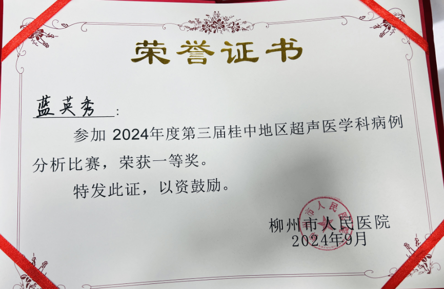 這次比賽是柳城縣人民醫(yī)院超聲科首次參加病例分享,成績的取得是對個人能力的肯定,更是對醫(yī)院超聲科整個團隊專業(yè)水平的認可。柳城縣人民醫(yī)院超聲科將以此次為新的起點,繼續(xù)在臨床診療服務(wù)工作中精耕細作,為患者提供更優(yōu)質(zhì)的服務(wù)。