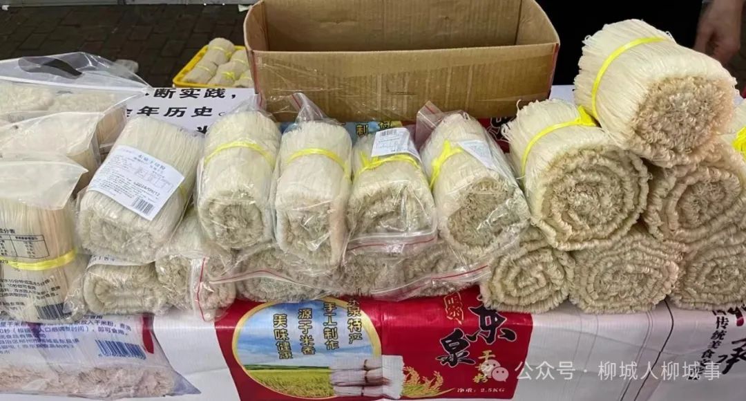 舞臺周圍設置了展位,除了柳城非遺腐竹、干切粉、牛臘巴等本土農(nóng)特產(chǎn)品外,還有其他美食小吃、家用器具、家居服裝等商品,攤位前的人流也絡繹不絕。大家邊走邊看邊嘗,挑選心儀物品,享受逛街購物的快樂。