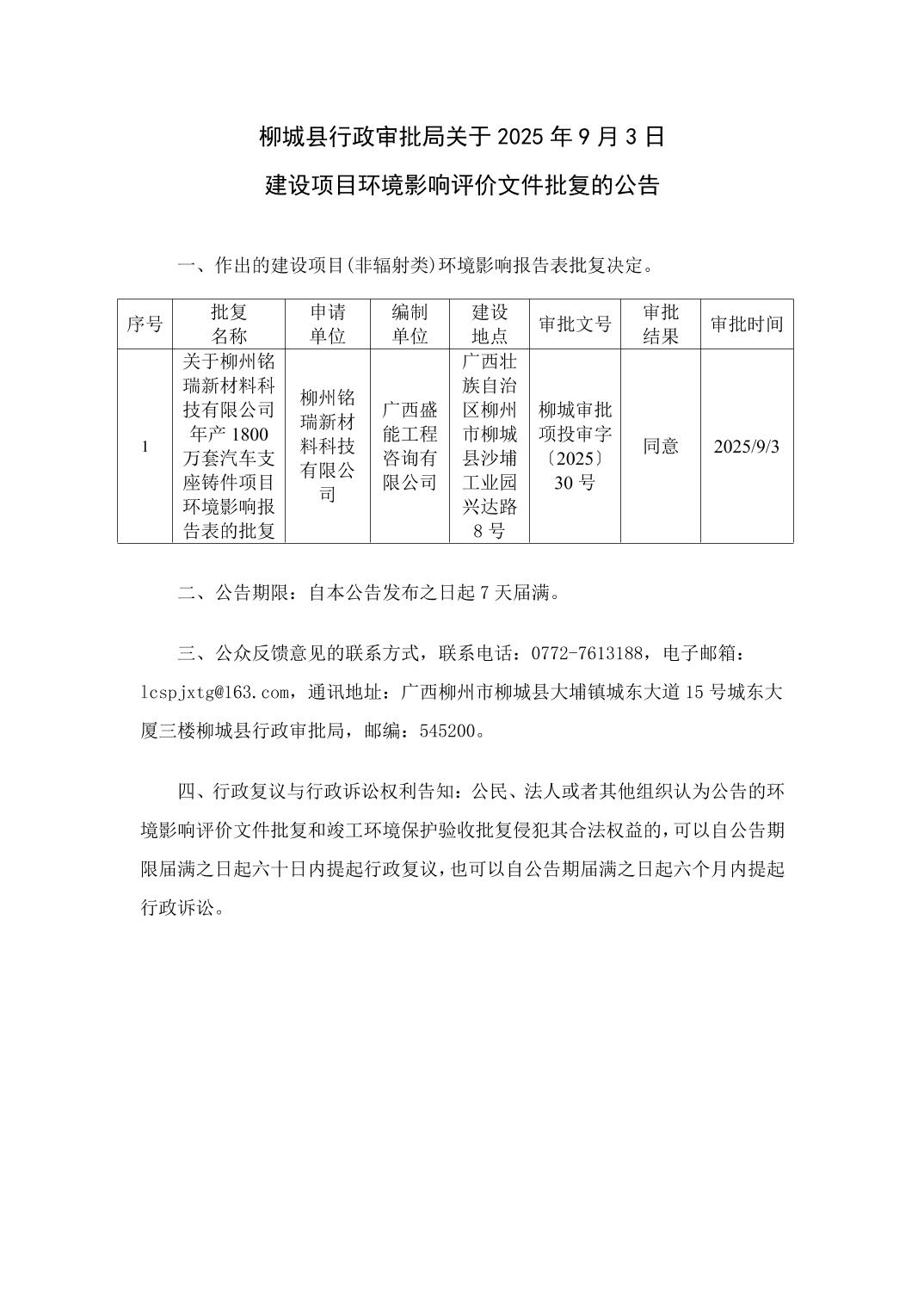 柳城縣行政審批局關(guān)于2025年9月3日建設(shè)項目環(huán)境影響評價文件批復的公告