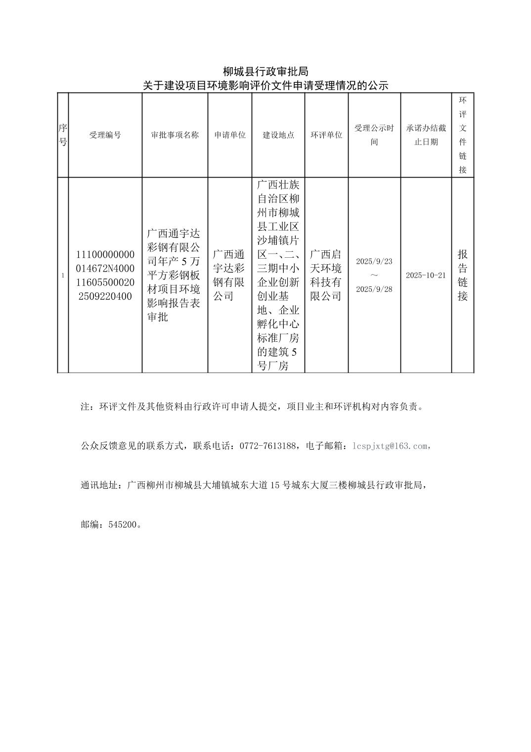 2025年9月23日柳城縣行政審批局關(guān)于建設(shè)項(xiàng)目環(huán)境影響評(píng)價(jià)文件申請(qǐng)受理情況的公示